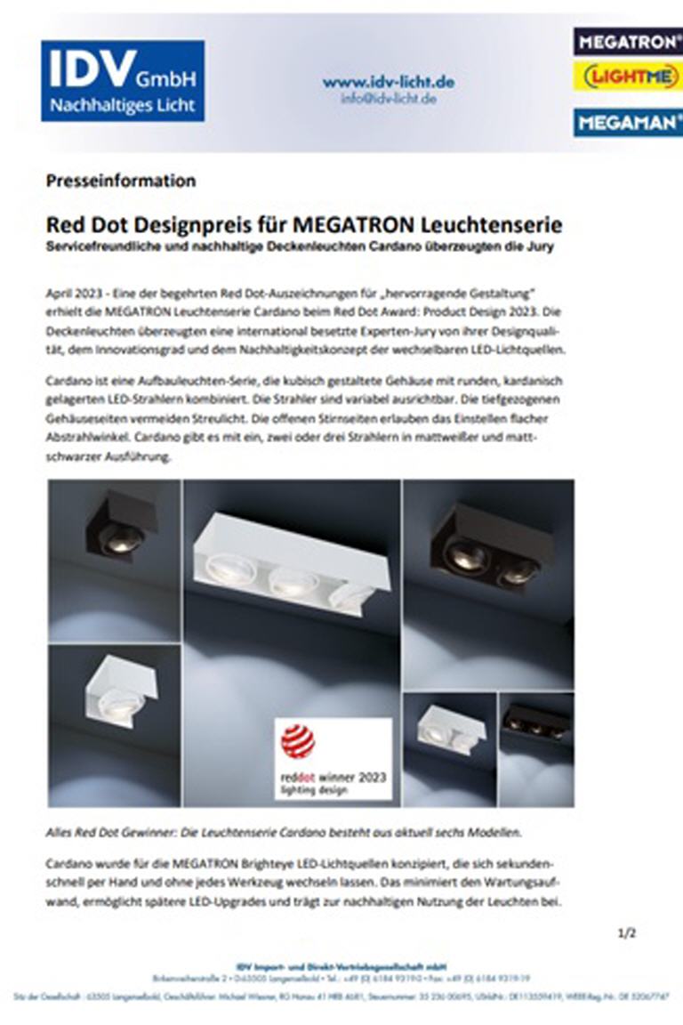 Sie sind hier: Startseite » Service » Presse Presseinformation Red Dot Designpreis für MEGATRON Leuchtenserie PDF Pressemappe CARDANO Red Dot ZIP